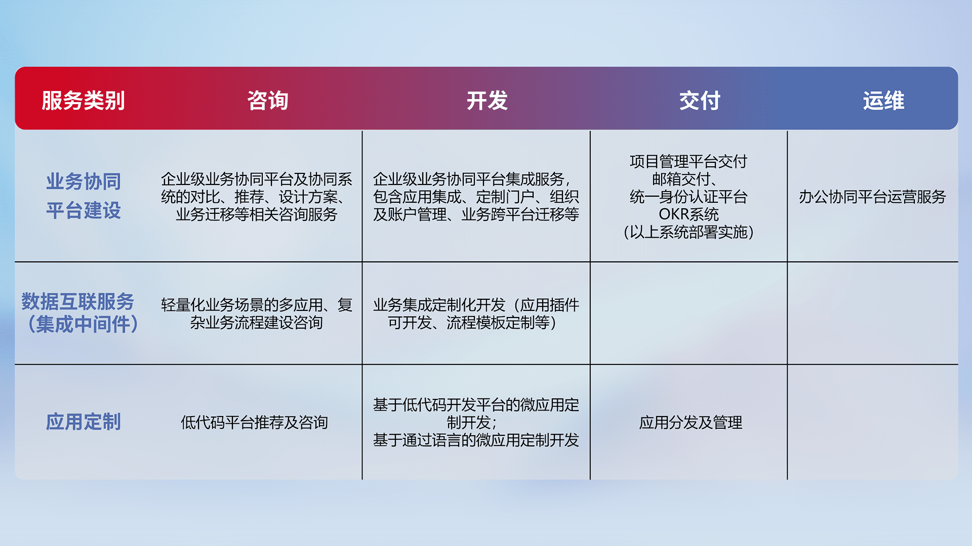 针对钉钉、、、企微、、、、IDaas等平台级产品提供产品的规划、、方案、、交付、、、定制化开发等服务,,实现如统一协同办公、、智能客户服务、、混合会议管理、、智能数据查询、、、、等业务场景,,,,实现数字化转型。。。。